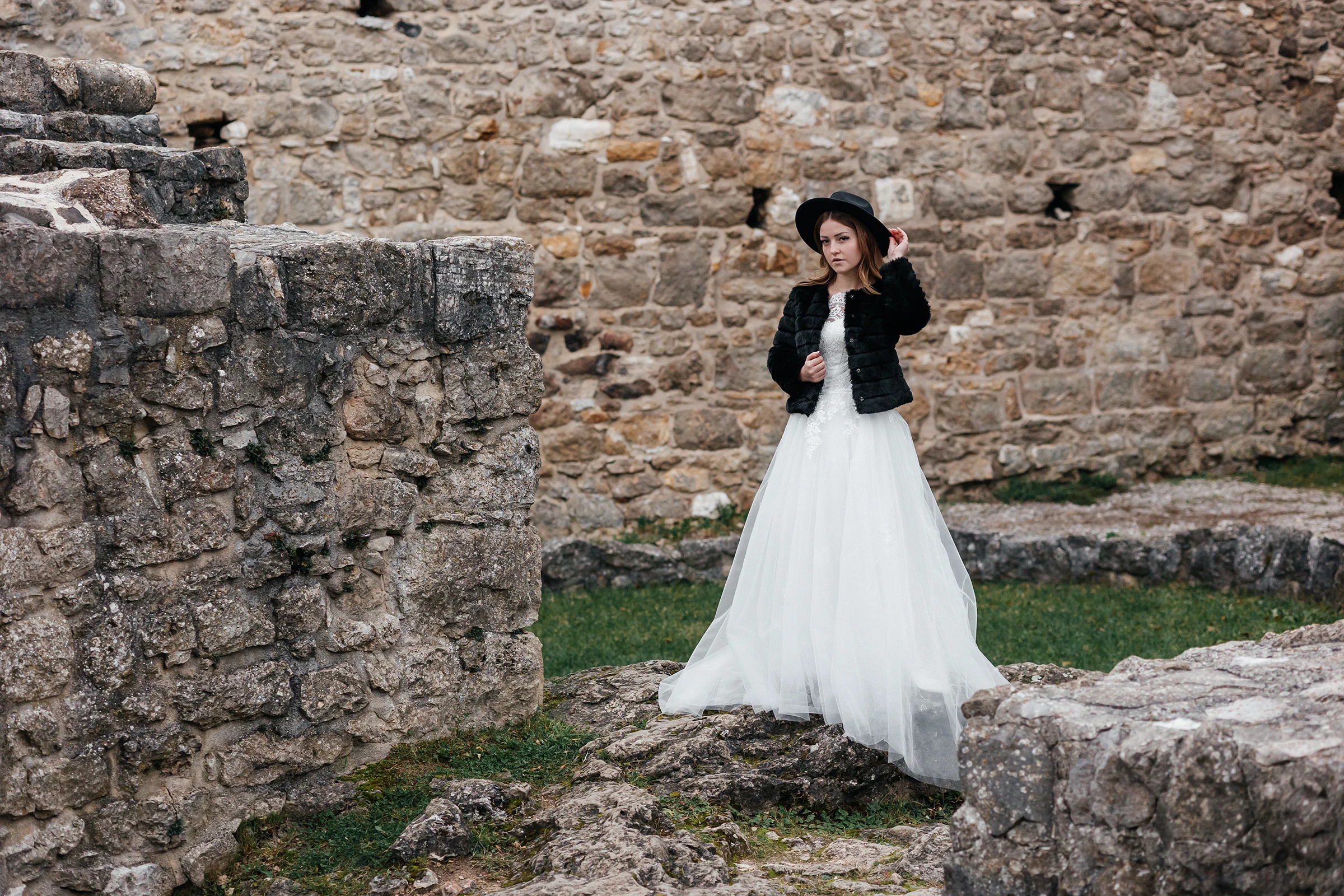 Outdoor-Aufnahmen mit Mantel + Brautkleid wirken ikonisch, selbst ohne Schnee.