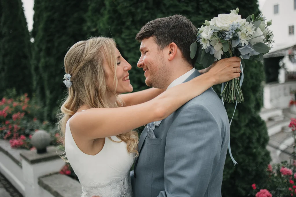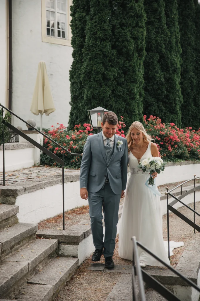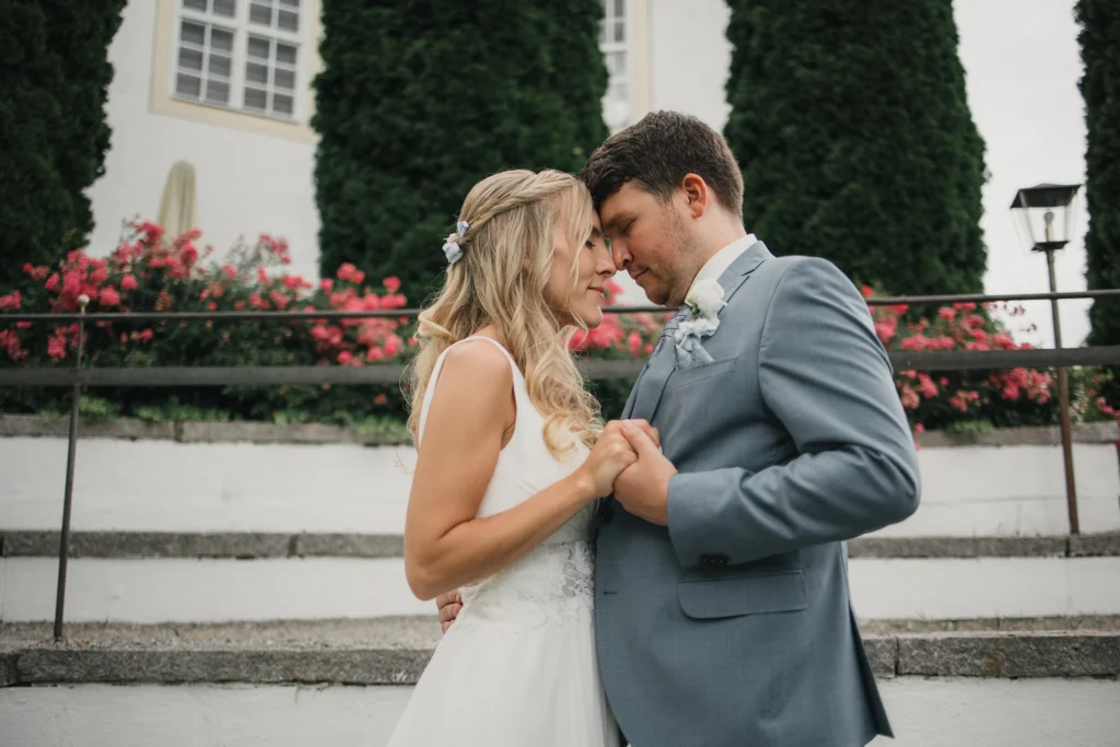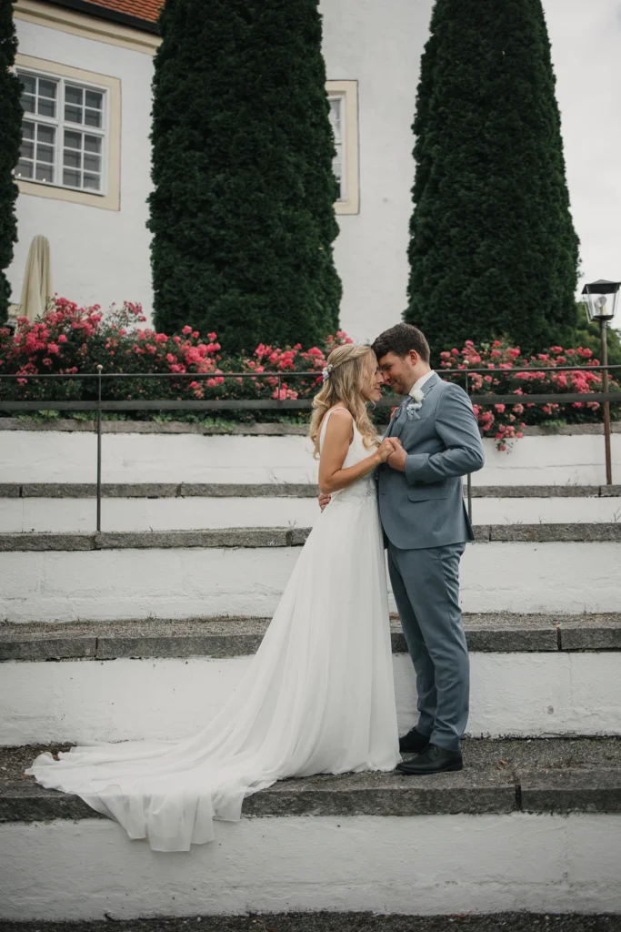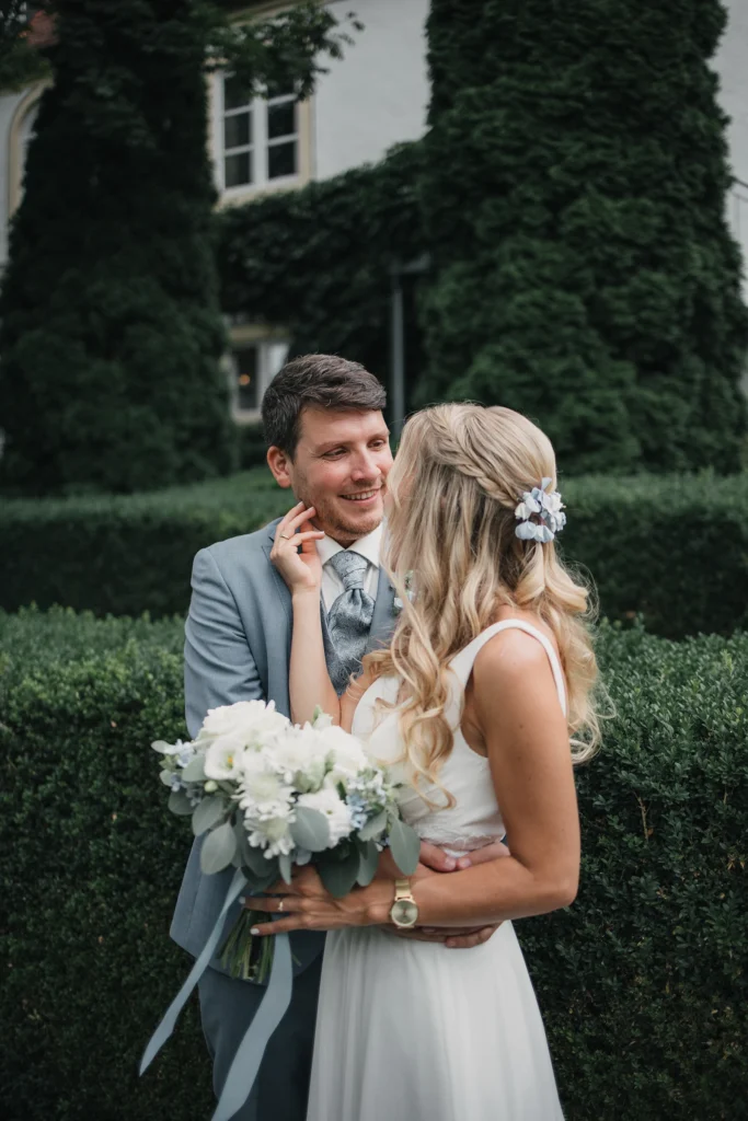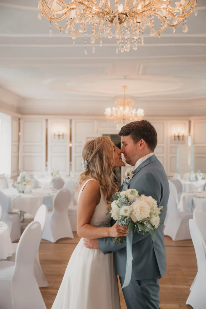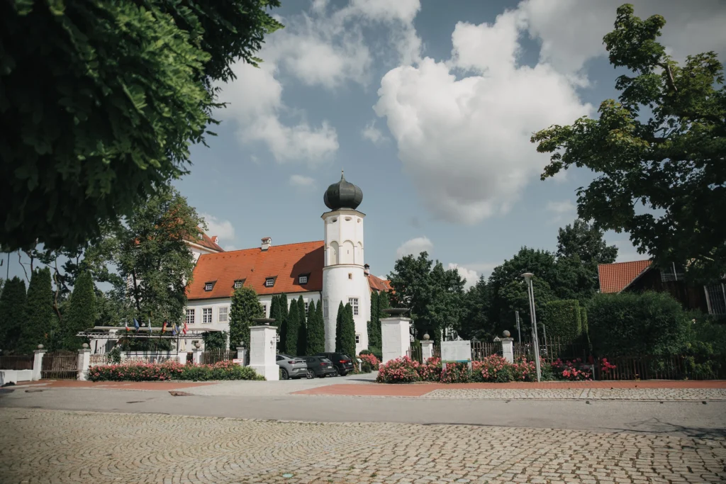Die Feier fand im Schloss-Hotel Neufahrn statt – ein Ort, an dem historische Architektur, helle Innenräume und gepflegte Schlossgärten eine wunderbar elegante Bühne bieten.