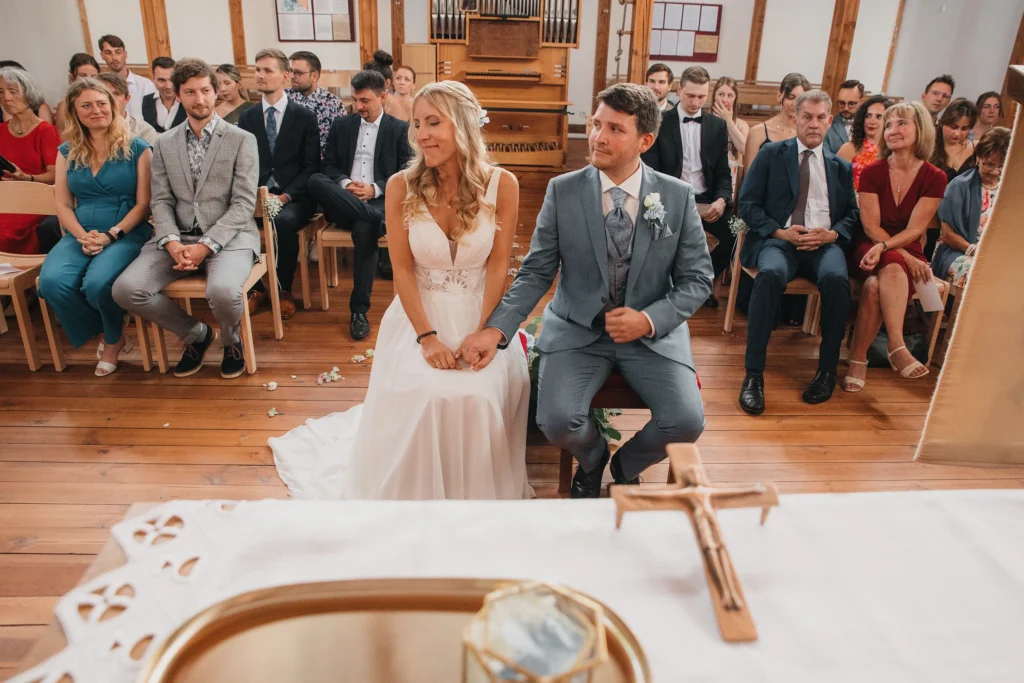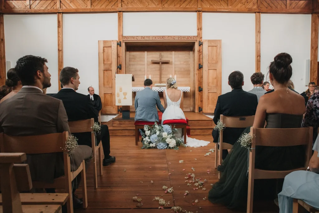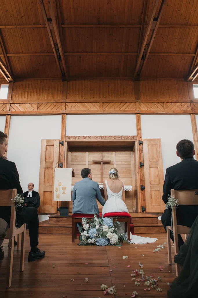 S. trat in einem eleganten Kleid mit feinen Spitzen-Details ein, T. wartete sichtbar gerührt vor dem Altar.
