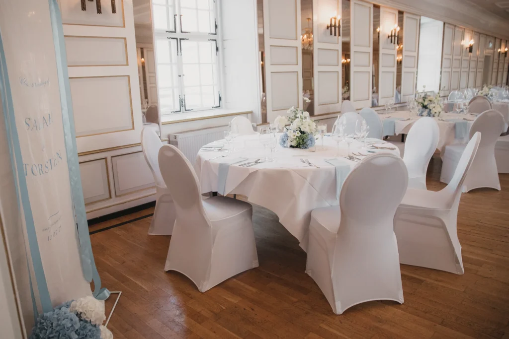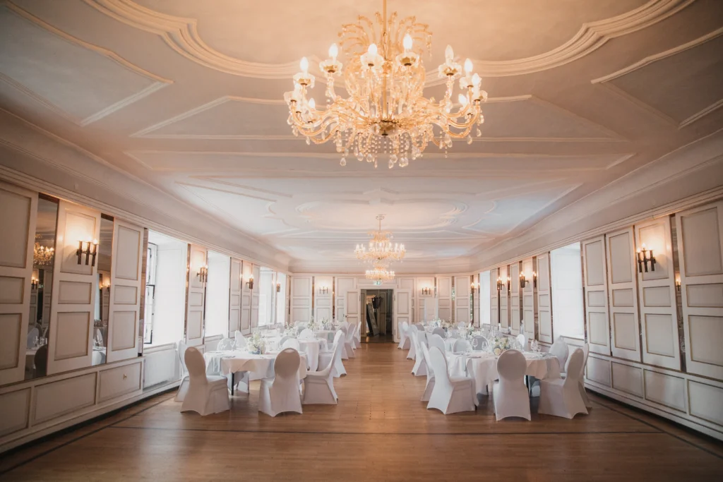 Der Festsaal im Schloss-Hotel Neufahrn ist hell, elegant und voller Charme: