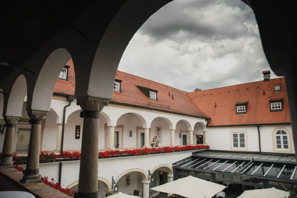 Im Innenhof, umgeben von hellen Arkaden, roten Blumen und alten Säulen, feierten S. & T. gemeinsam mit ihren Gästen den Moment.
