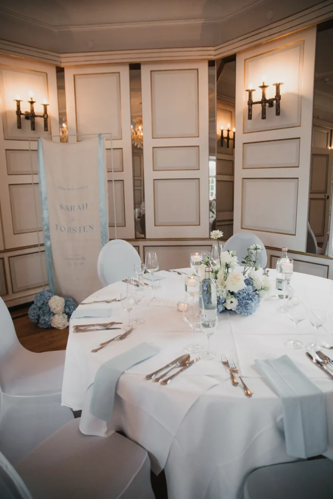 Kaffee, Kuchen & Dinner – Weiß-Gold-Himmelblau als Farbkonzept