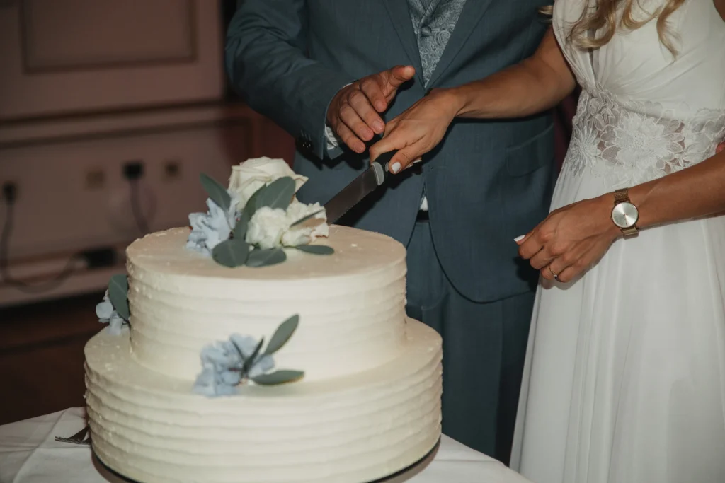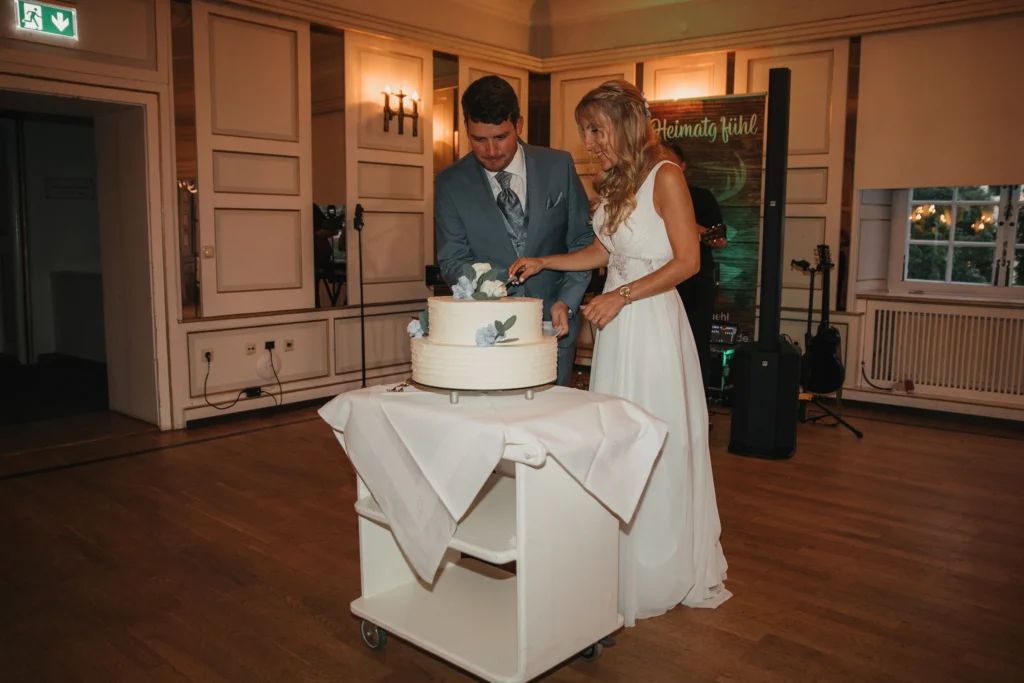 Ich durfte die beiden über 10 Stunden begleiten: von der kirchlichen Trauung über den Empfang bis zum ersten Tanz und dem Tortenanschnitt am Abend.